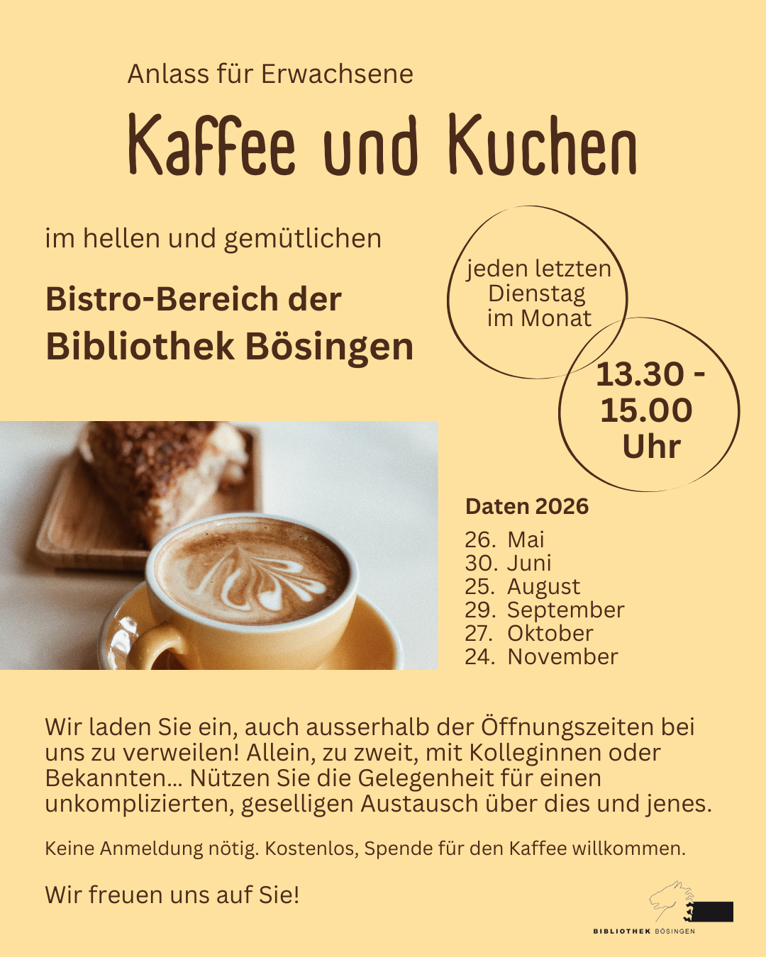 Aufgrund einer Datumskollision mit einem anderen Anlass findet "Kaffee und Kuchen" am letzten Dienstag im Monat statt - nicht wie ursprünglich publiziert am ersten.
