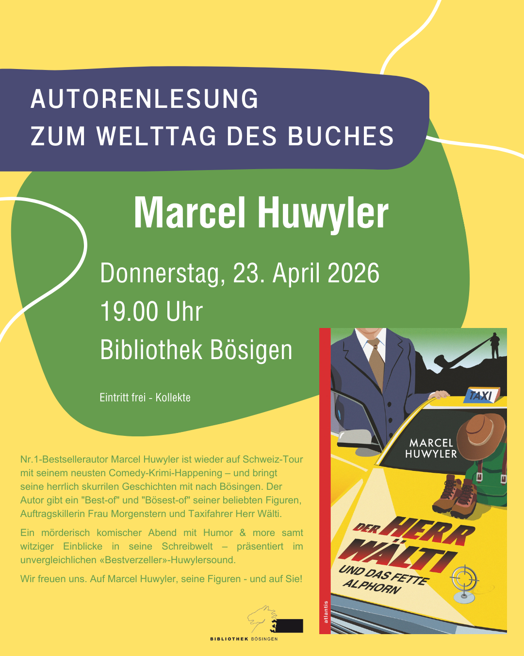 Nr.1-Bestsellerautor Marcel Huwyler ist wieder auf Schweiz-Tour mit seinem neusten Comedy-Krimi-Happening – und bringt seine herrlich skurrilen Geschichten mit nach Bösingen. Der Autor gibt ein "Best-of" und "Bösest-of" seiner beliebten Figuren, Auftragskillerin Frau Morgenstern und Taxifahrer Herr Wälti.